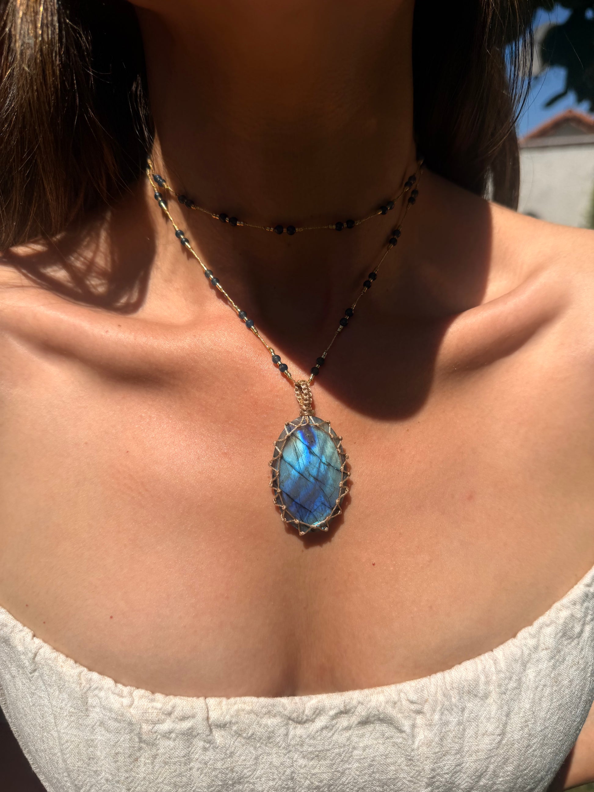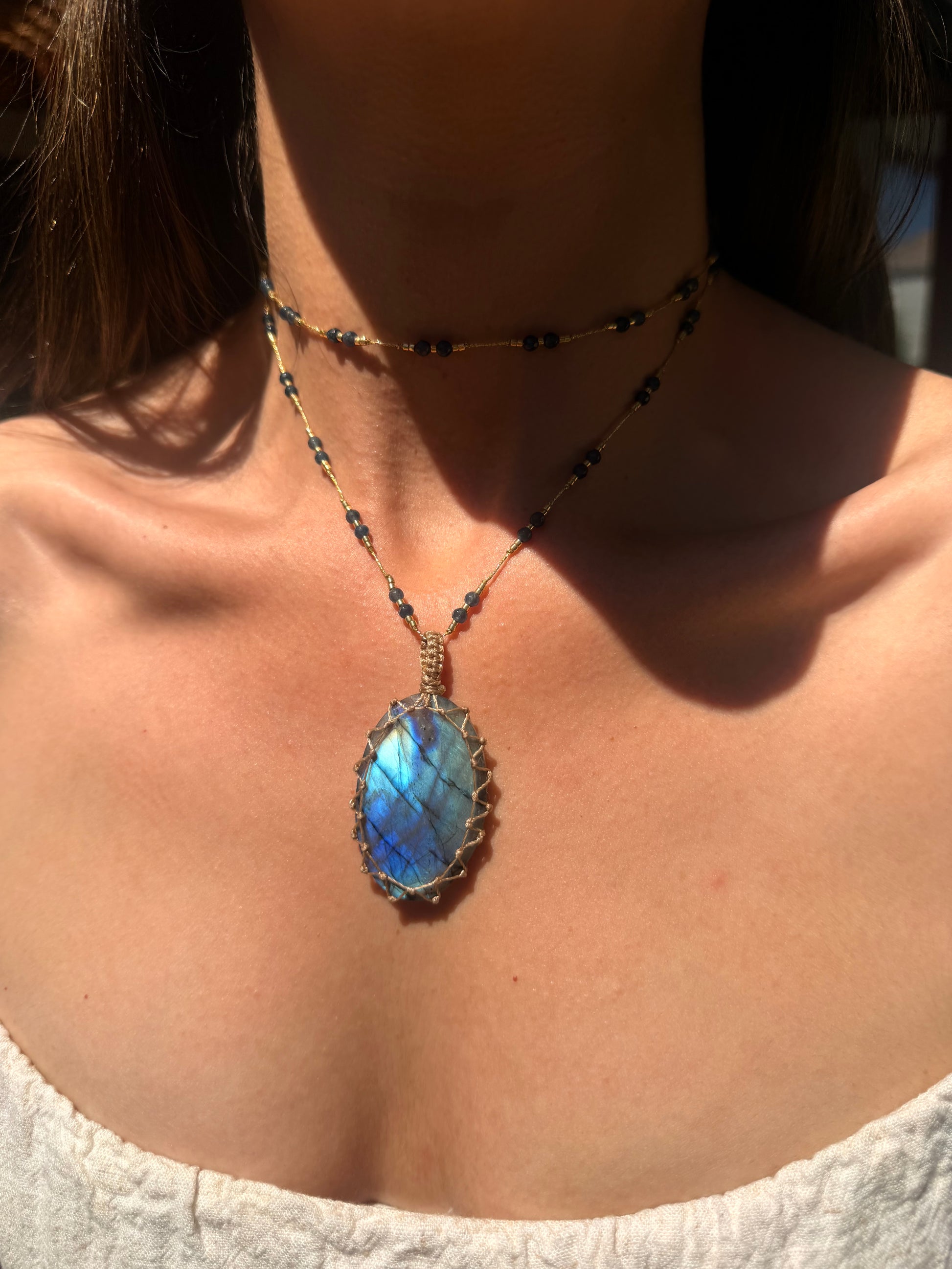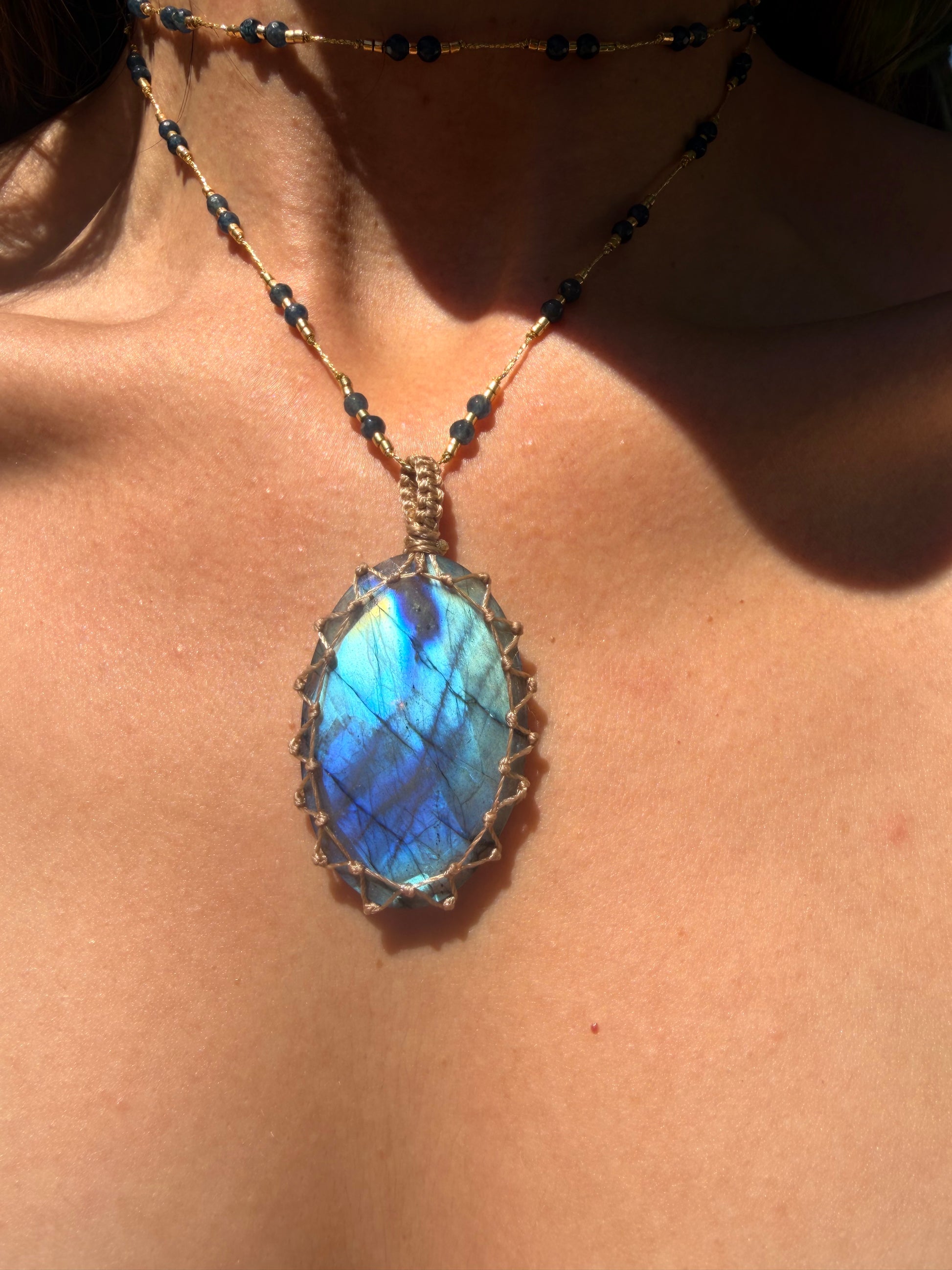 El colgante de labradorita XL esta envuelto en un juego de hilo resistente, y acompañado de ágatas azules con mostacillas bañadas en oro, al igual que las terminaciones.